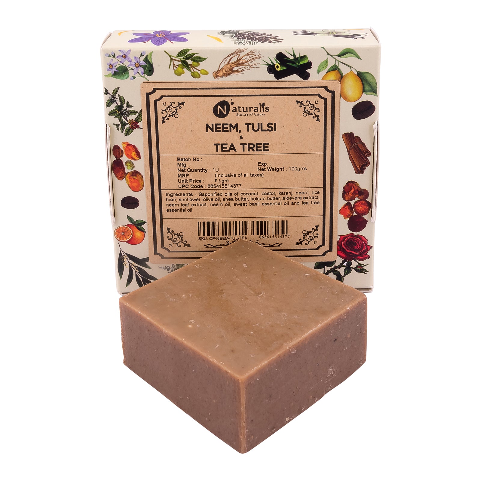 • Ingredients: Saponified oils of coconut, castor, karanj, neem, rice bran, sunflower, olive oil, shea butter, kokum butter, aloevera extract, neem leaf extract, neem oil, sweet basil essential oil and tea tree essential oil